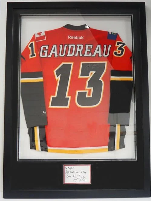 Our Jersey Box Displays are custom made to order. From a basic cost effective design to designs with multiple mat colours and multiple mat openings to add a photograph, a hockey puck or an engraved recognition or name plate. Our team can design a jersey box to fit your items in a stunning display. We also frame hockey sticks, pucks and baseball bats with regular or protective UV glass with a background colour of your choice.